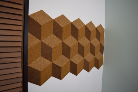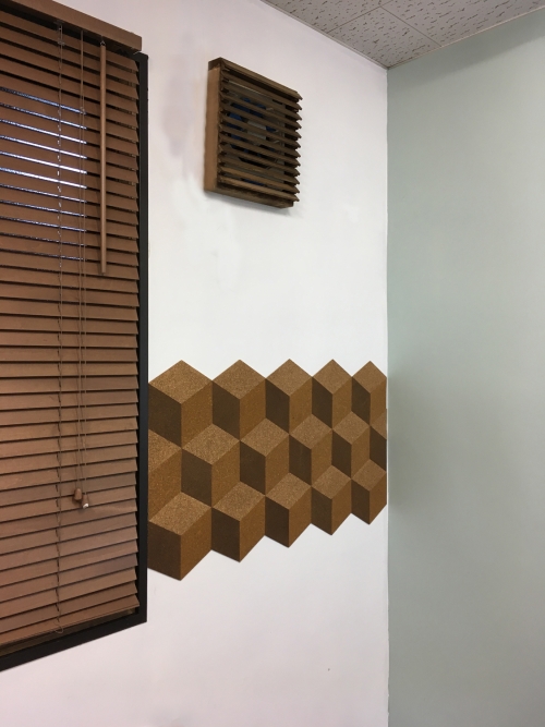 3.壁に貼る・・・両面テープで壁に貼っていきます。3色を組み合わて配置していくだけでこのように立体的なデザインに!